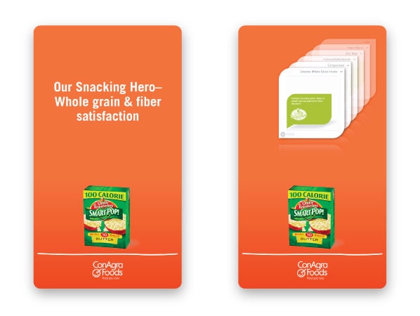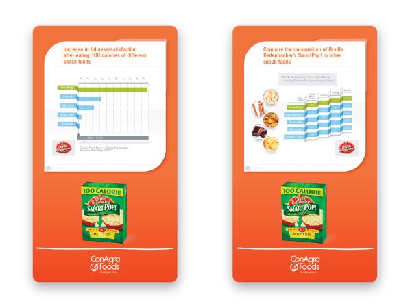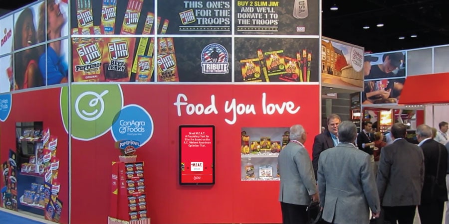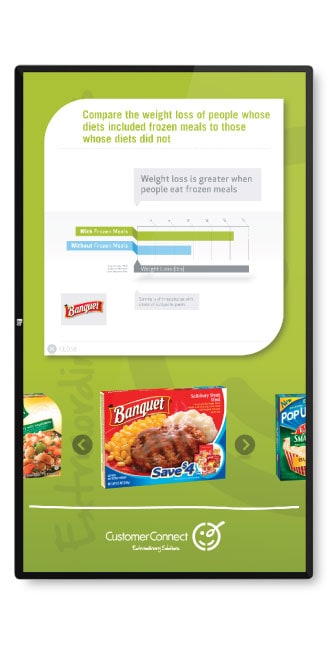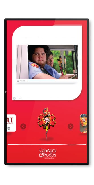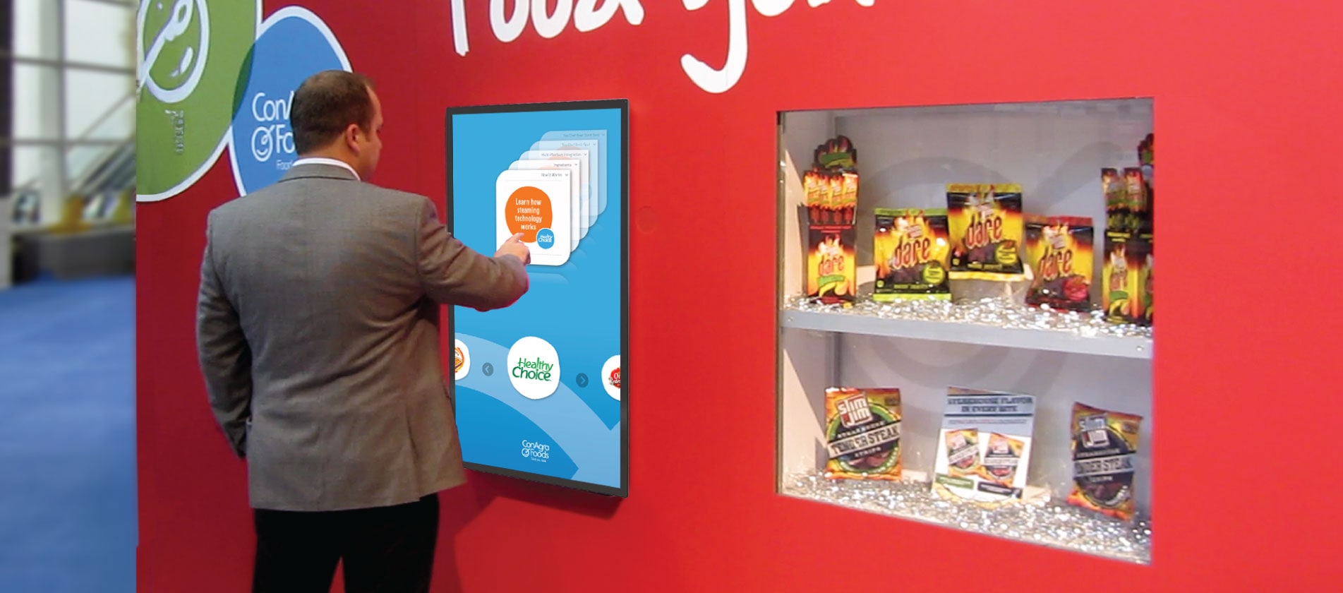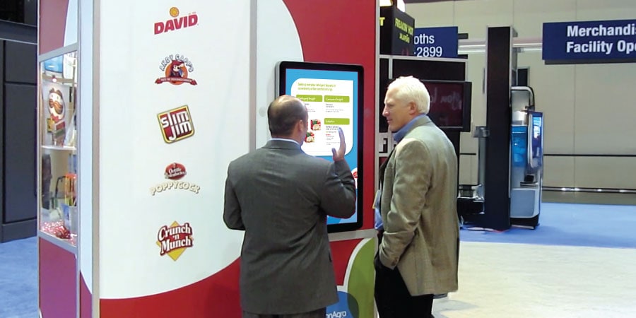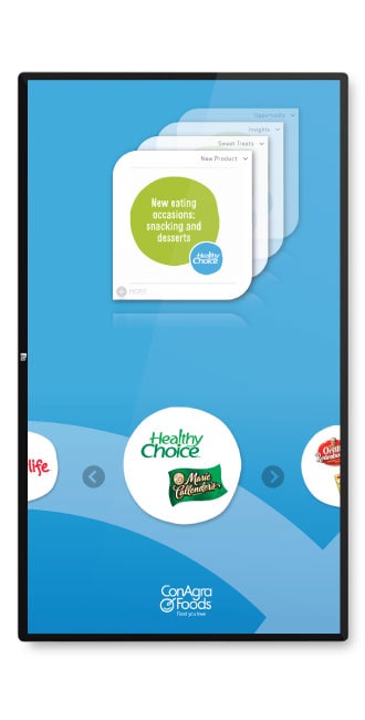 Users navigated between products by selecting buttons or clicking directly on icons, with detailed information presented in an interactive card stack for intuitive browsing. A single click tone provided audio feedback for each action, enhancing usability and responsiveness in noisy event environments.